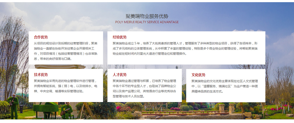 公司創(chuàng)始人吳江華先生有著豐富的行業(yè)管理經(jīng)驗(yàn),熟知行業(yè)發(fā)展動(dòng)態(tài),具有較強(qiáng)的性和的市場(chǎng)洞察力,對(duì)行業(yè)有深刻的認(rèn)識(shí)和獨(dú)到的理解,尤其注重服務(wù)質(zhì)量和品牌意識(shí),為公司長(zhǎng)遠(yuǎn)發(fā)展樹(shù)立明確的文化理念。同時(shí),聚美瑞物業(yè)公司有著堅(jiān)實(shí)的經(jīng)濟(jì)基礎(chǔ)和豐富的社會(huì)資源,公司從成立以來(lái)今與多家公司合作,均獲得了各公司的一致好評(píng),此外,依托地緣優(yōu)勢(shì),公司能實(shí)現(xiàn)便捷高效的人力、物理力、財(cái)力等資源的調(diào)配,便于項(xiàng)目的迅速開(kāi)展,高質(zhì)量的完成目標(biāo)。