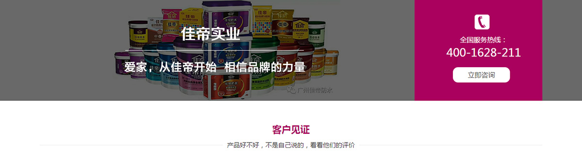 佳帝實(shí)業(yè)成立于2001年,總部位于香港,是一家為建筑行業(yè)提供涂料、防水材料、建筑乳液、瀝青乳化涂料、水性硅藻系列產(chǎn)品及技術(shù)施工方案的全球性建材企業(yè)。多年以來(lái),公司依托高水準(zhǔn)的研發(fā)實(shí)驗(yàn)室、現(xiàn)代化的生產(chǎn)車間、的產(chǎn)品質(zhì)量以及完善的售后服務(wù)體系,贏得了良好的消費(fèi)者口碑。