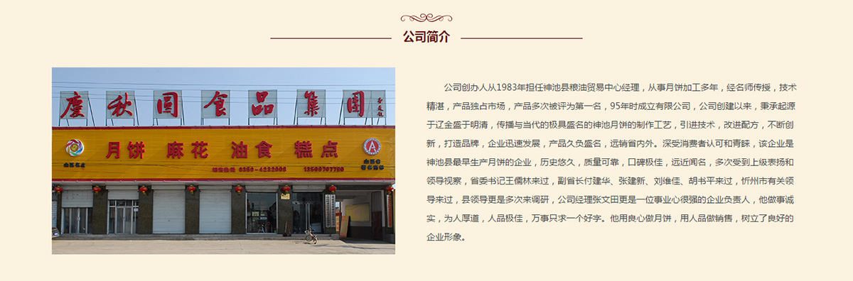 公司創(chuàng)辦人從1983年擔任神池縣糧油貿易中心經理,從事月餅加工多年,經名師傳授,技術精湛,產品獨占市場,產品多次被評為名,95年時成立有限公司,公司創(chuàng)建以來,秉承起源于遼金盛于明清,傳播與當代的盛名的神池月餅的制作工藝,引進技術,改進配方,不斷創(chuàng)新,打造品牌,企業(yè)迅速發(fā)展,產品久負盛名,遠銷省內外。深受消費者認可和青睞,該企業(yè)是神池縣早生產月餅的企業(yè),歷史悠久,質量可靠,口碑,遠近聞名,多次受到上級表揚和領導視察,省委書記儒林來過,副省長付建華、張建新、劉維佳、胡書平來過,忻州市有關領導來過,縣領導更是多次來調研,公司經理張文田更是一位事業(yè)心很強的企業(yè)負責人,他做事誠實,為人厚道,人品,萬事只求一個好字。他用良心做月餅,用人品做銷售,樹立了良好的企業(yè)形象。