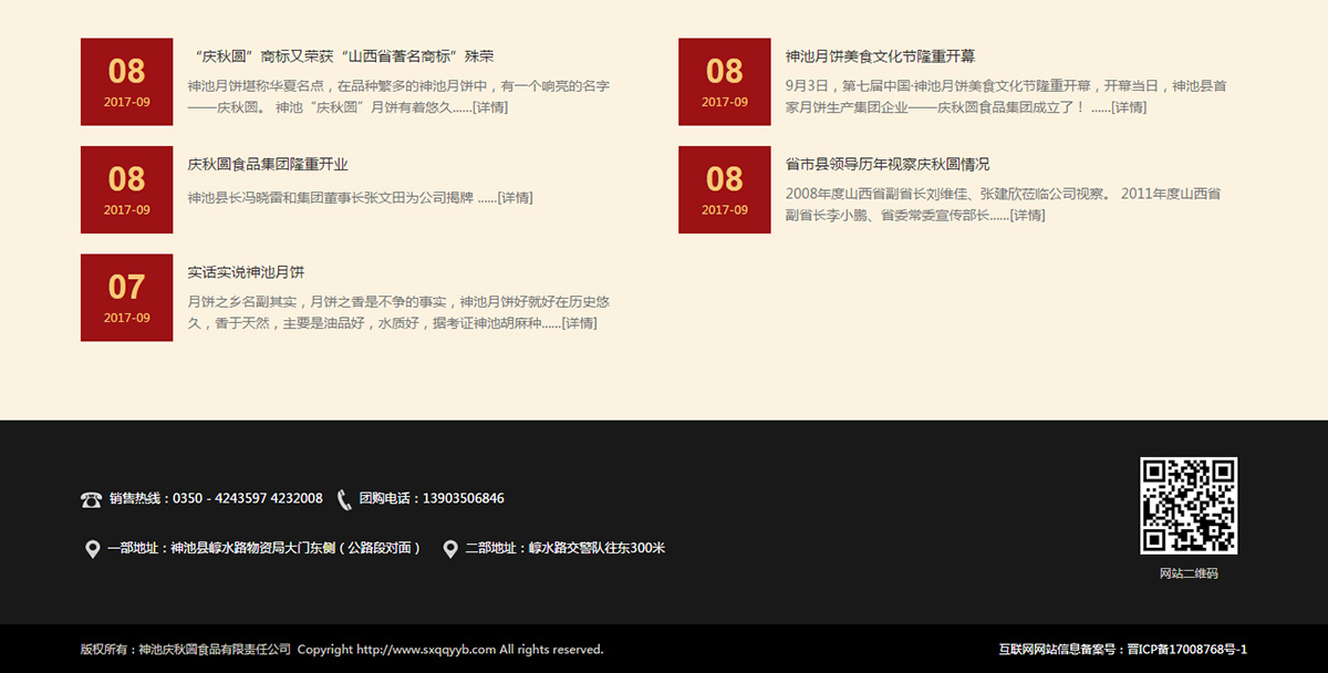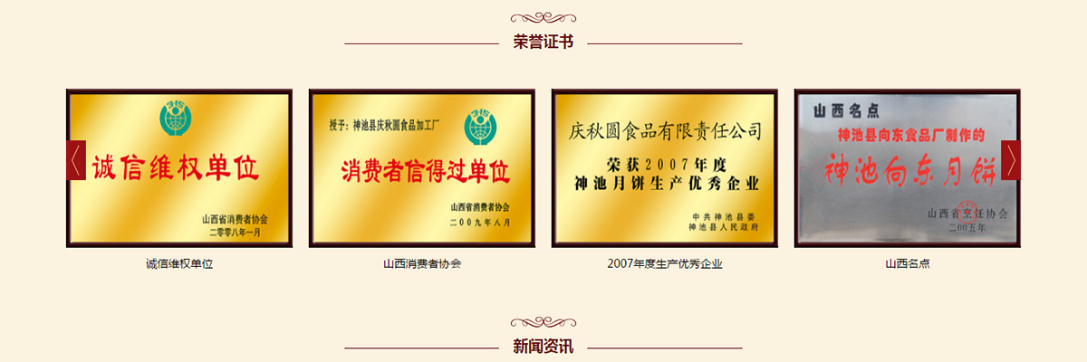 公司成立以來,先后通過了國家QS質量認證,榮獲“神池縣月餅神池企業(yè)”,“忻州市消費者協(xié)會信得過產品”,“山西省消費者協(xié)會誠信維權單位”,“忻州市民營企業(yè)”,“山西名點”等多項稱號,慶秋圓商標也獲得“山西省商標”。