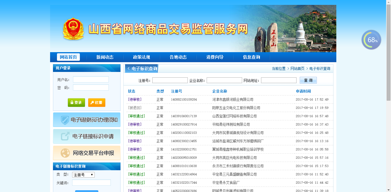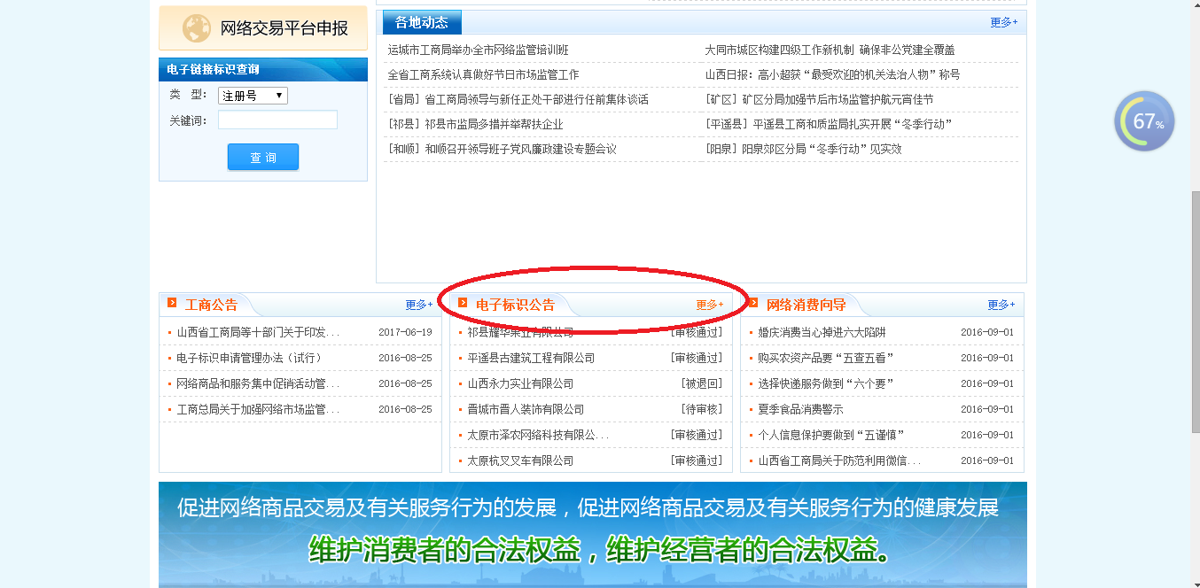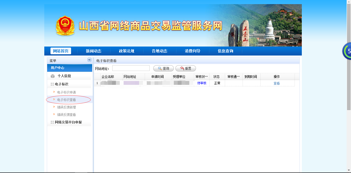 申請(qǐng)后可在山西省網(wǎng)絡(luò)商品監(jiān)管服務(wù)網(wǎng)電子標(biāo)識(shí)公告如下圖: