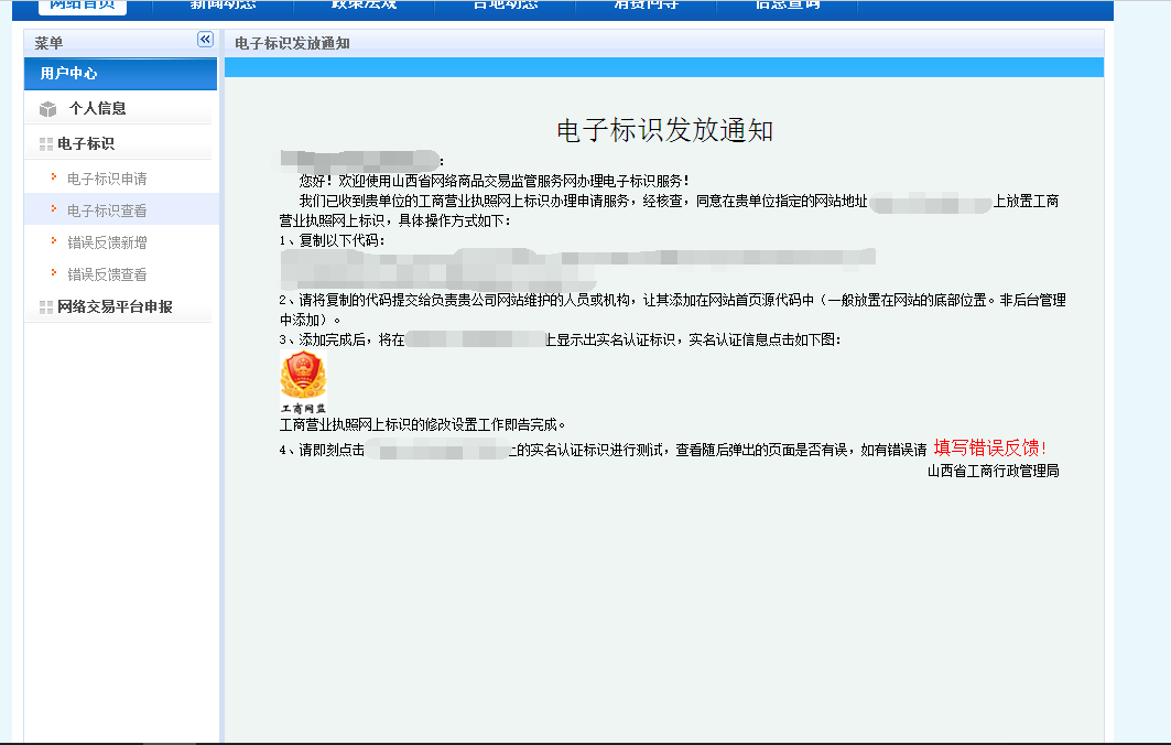 電子標(biāo)識(shí)申請(qǐng)成功后,可在用戶中心-->電子標(biāo)識(shí)查看,如下圖:
