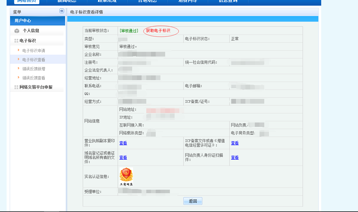電子標(biāo)識(shí)申請(qǐng)成功后,可在用戶中心-->電子標(biāo)識(shí)查看,如下圖: